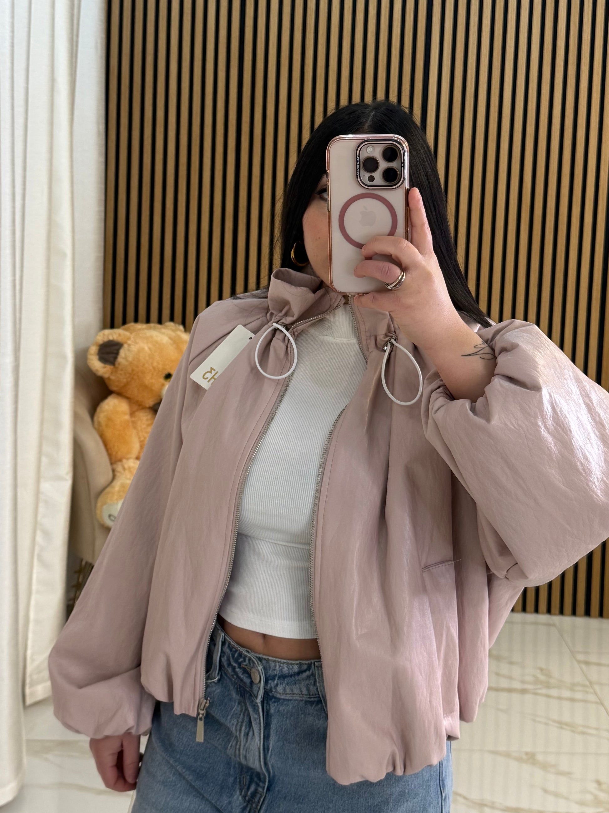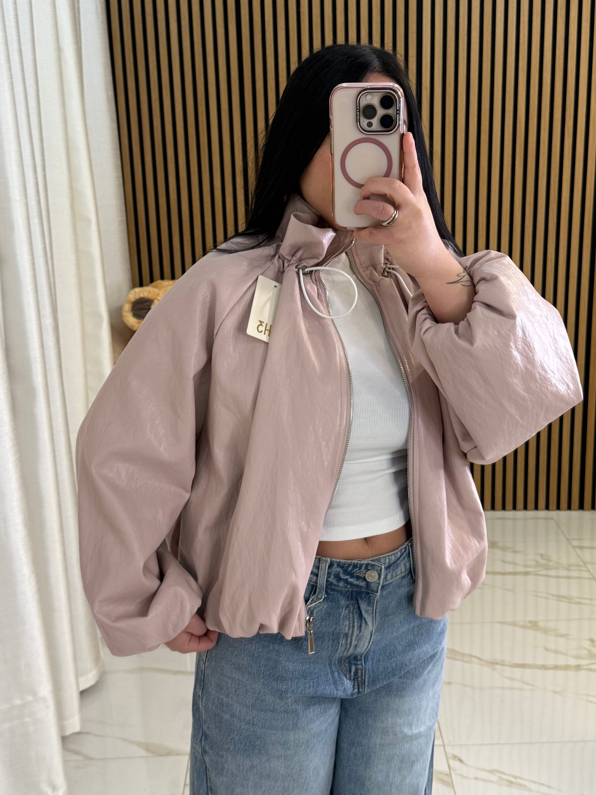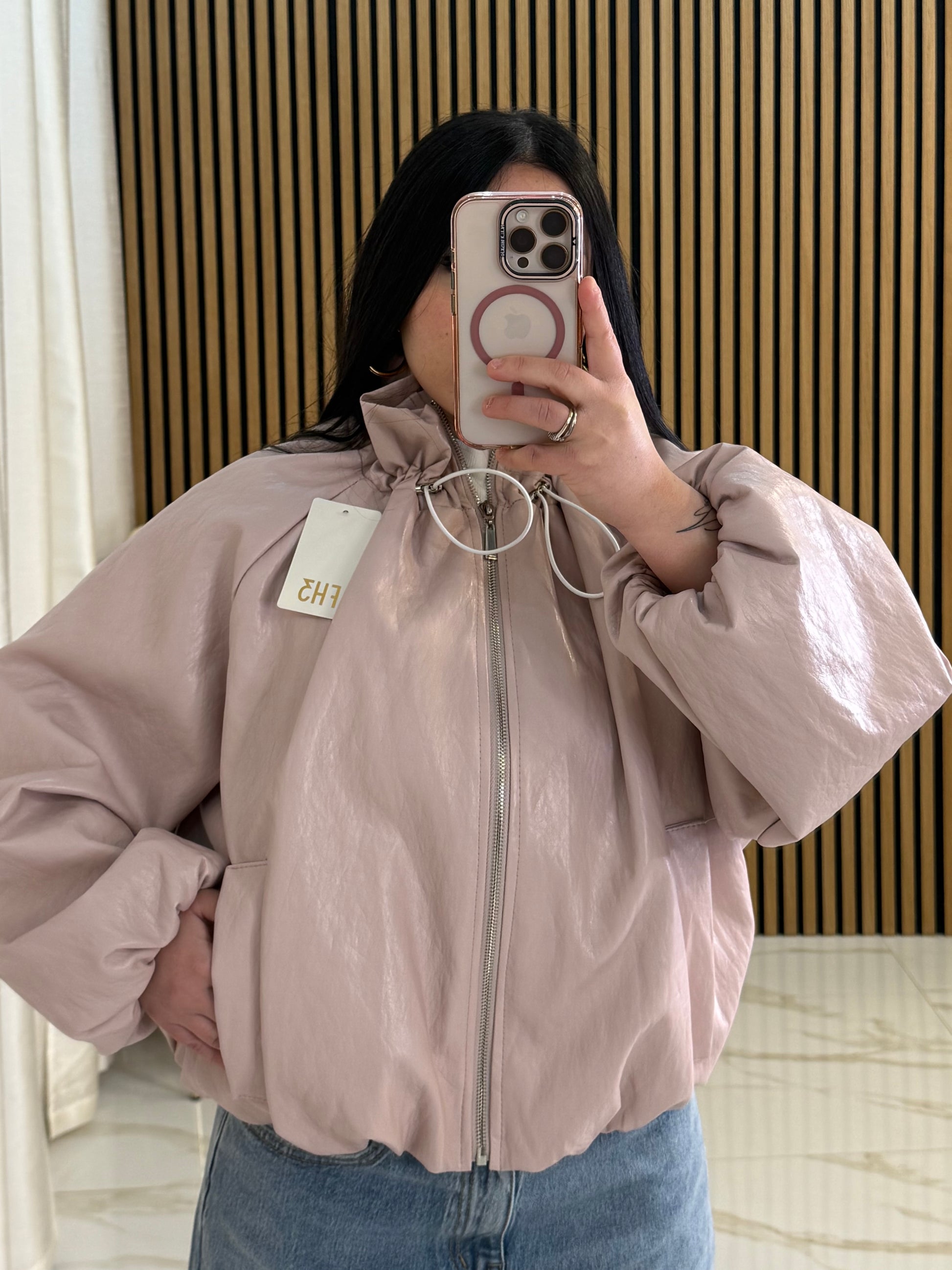 Giubbino in ecopelle colletto regolabile con coulisse,elastico ai polsi e sul bordo finale, taglia unica veste da xs a XL